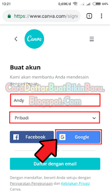 - Sekarang mendaftar akun Canva, masukkan Nama, Bidang Pekerjaan dan silahan mau daftar menggunakan akun Google atau Facebook. Contoh, disini saya pilih yang opsi Google