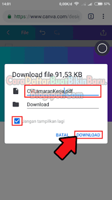 - Masukan nama file yang di ingikan, contoh CV lamaran kerja, lalu centang kotak yang ada tulisan jangan tampilkan lagi, kalau sudah pilih link Download
