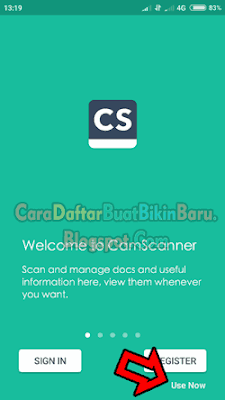 - Pada tampilan awal “Welcome to CamScanner” pilih link USE NOW