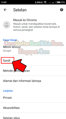 5. Selanjutnya Anda akan melihat halaman Sandi, kalau dulu kita pernah login Gmail atau akun Instagram, Facebook maupun akun lain lewat Chrome dan menyimpan kata sandi akun tersebut maka kita bisa mengetahui password email di Hp (seperti gambar dibawah), lanjut tab layar Hp tepat di area accounts.google.com alamat Gmail Anda