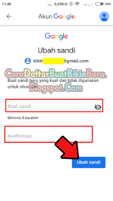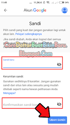 - Lah yang di tahap inilah kamu buat password Gmail yang rumit atau kuat minimal 8 karakter dengan menggabungkan Angka, Simbol, Huruf Besar & Kecil lalu konfirmasi sandi di kolom bawahnya. Kalo sudah, tab tombol UBAH SANDI