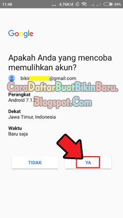 - Nah, akan nongol pemberitahuan yang isinya “Apakah Anda yang mencoba memulihkan akun?” dengan keterangan versi Android, lokasi dan waktu. Kamu tinggal pilih tombol YA