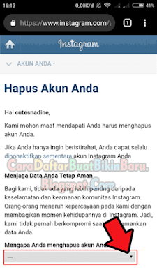 - Halaman untuk hapus IG selamanya, sama seperti ketika Anda ingin menonaktifkan Instagram sementara. Akan tetapi yang harus Anda lakuin saat berada di tampilan seperti gambar dibawah, silahkan pilih Alasan Penghapusan akun (Lihat screenshot ini)