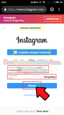 - Setelah mengakses link delete akun diatas maka Anda akan di arahkan kehalaman login akun, pastikan setingan bahasa dari halaman tersebut Bahasa Indonesia, silahkan Anda masuk seperti biasa pake FB kalau sudah pernah menghubungkan Instagram dengan Facebook, atau pakai user Id , email maupun nomor Hp dan lanjut masukkan juga password IG nya