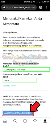 - Tampilan selanjutnya pilih Alasan Kenapa Ingin Menonaktifkan Instagram, lanjut masukkan Password kalau sudah tab tombol Akun Dinonaktifkan Sementara