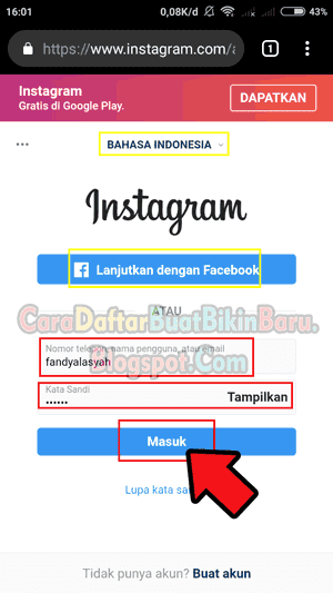 - Setelah mengakses link delete akun diatas maka Anda akan di arahkan kehalaman login akun, pastikan setingan bahasa dari halaman tersebut Bahasa Indonesia, silahkan Anda masuk seperti biasa pake FB kalau sudah pernah menghubungkan Instagram dengan Facebook, atau pakai user Id , email maupun nomor Hp dan lanjut masukkan juga password IG nya