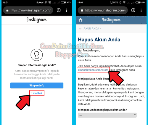 - Berikutnya pilih Lain Kali untuk tawaran Instagram menyimpan kata sandi, kalau sudah halaman akan mengarah langsung ke tempat dimana kita bisa hapus akun Instagram Sementara atau pun Selamanya, jika sekarang hanya ingin menonaktifkan sementara IG maka tab link Dinonaktifkan Sementara
