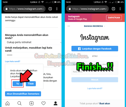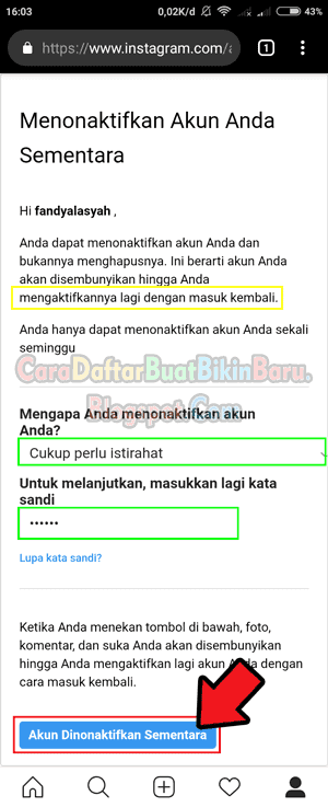 - Tampilan selanjutnya pilih Alasan Kenapa Ingin Menonaktifkan Instagram, lanjut masukkan Password kalau sudah tab tombol Akun Dinonaktifkan Sementara