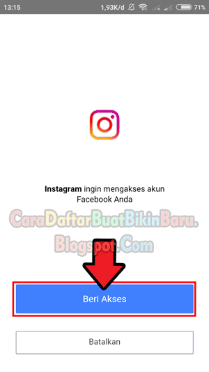 - Pada tampilan Instagram ingin Mengakses Akun Facebook Anda, kita hanya perlu menyentuh tombol Beri Akses.